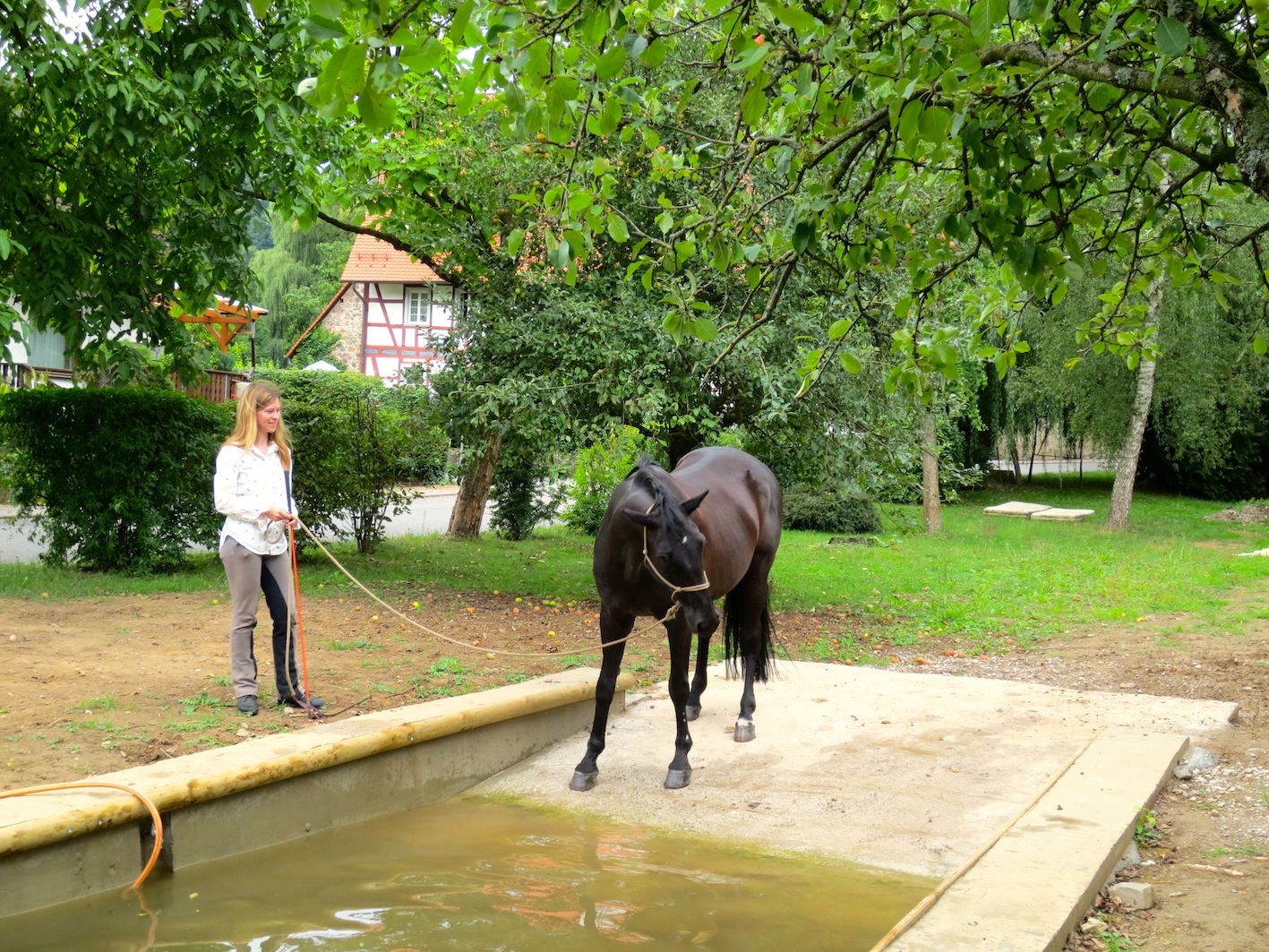 Unser Ausflug zum Pferdespielplatz startete so: Projektwallach parkte in voller Montur mit Transportgamaschen und Fliegendecke vor dem Hänger. Ich bin noch mal zurück zur Box, um einen Eimer zu holen. Da hörte ich es lachen. Ich ging zurück – die Pferde standen drin, in Sekunden vollständig verladen. Meine Mitreiterinnen erzählten dann, dass der Isi schon mal eingestiegen ist, Paledo dann beschloss mitzufahren und sich neben dran gestellt hat. Eigenständig mit Strick überm Hals. Das Einladen für die Rückfahrt erfolgte dann auf Fingerzeig. Ich würde das jetzt so gern meinem Training zuschreiben, aber das wäre glatt gelogen. Das Pferd ist einfach so. Ich freue mich natürlich trotzdem, dass Fahrten ihn nicht zu stressen scheinen. Unser Ziel war die Spielwiese des Hasselhofs in Birkenau, etwa 25 Minunten Hängerfahrt von unsrem Stall entfernt. Die Anlage ist kein Extrem-Trail, sondern ein baumumstandener Garten voller Obstgehölze und darum verstreuten Hindernissen – darunter ein Flattervorhang, verschiedene Podeste und als Highlight eine neu ausgebaute Wasserstraße. Fertig ist der Spielplatz noch nicht ganz – mitten drin zwei Berge Erdaushub und ein Fahrspur-breiter Streifen Erde auf dem Gras. Hinein in den Parcours schritten wir durch einen Rosenspalier, und er gehört zu dem Bild, das mir im Kopf bleiben wird: ein liebevoll angelegter Garten für Pferde.